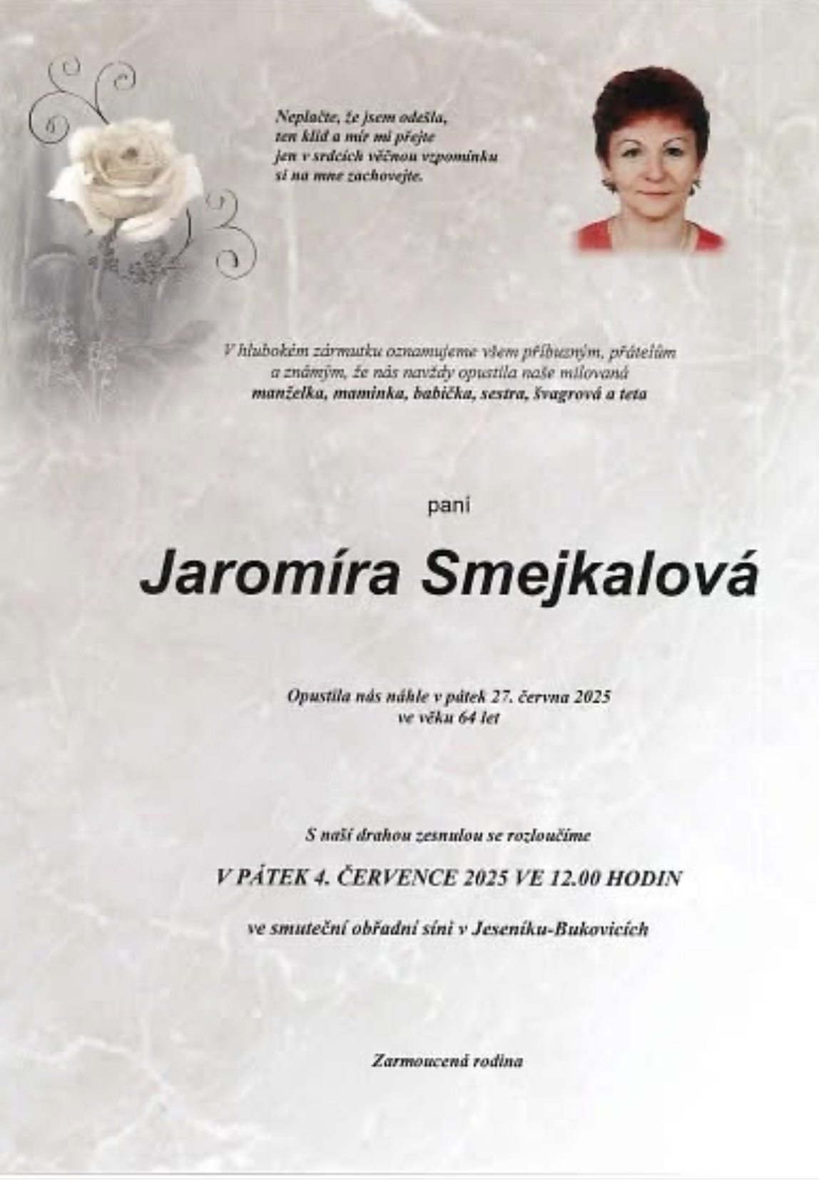 30.06.2025 19:31Bohužel nás náhle opustila kamarádka a spoluhráčka Jaromíra Smejkalová z Jeseníku. Parte