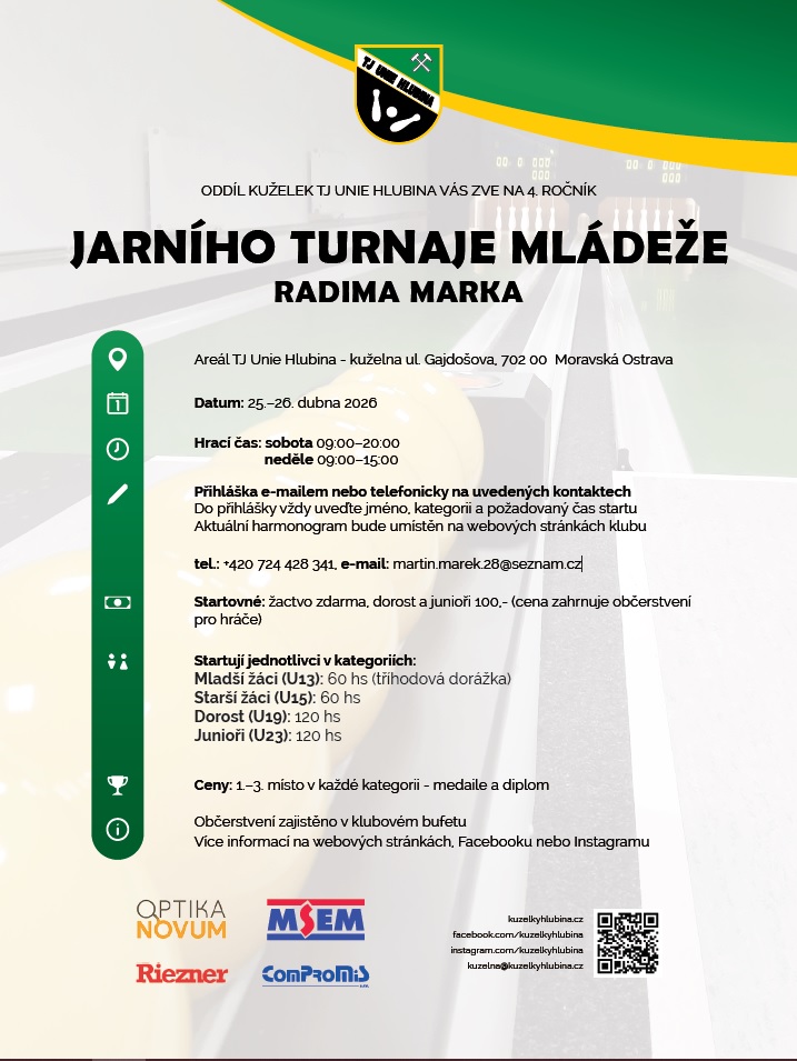 jménem kuželkářského oddílu TJ Unie Hlubina bych Vás rád pozval do Ostravy na náš tradiční jarní turnaj mládeže, který se uskuteční na dvoudráze na Hlubině v termínu 25.-.26.4.2026.